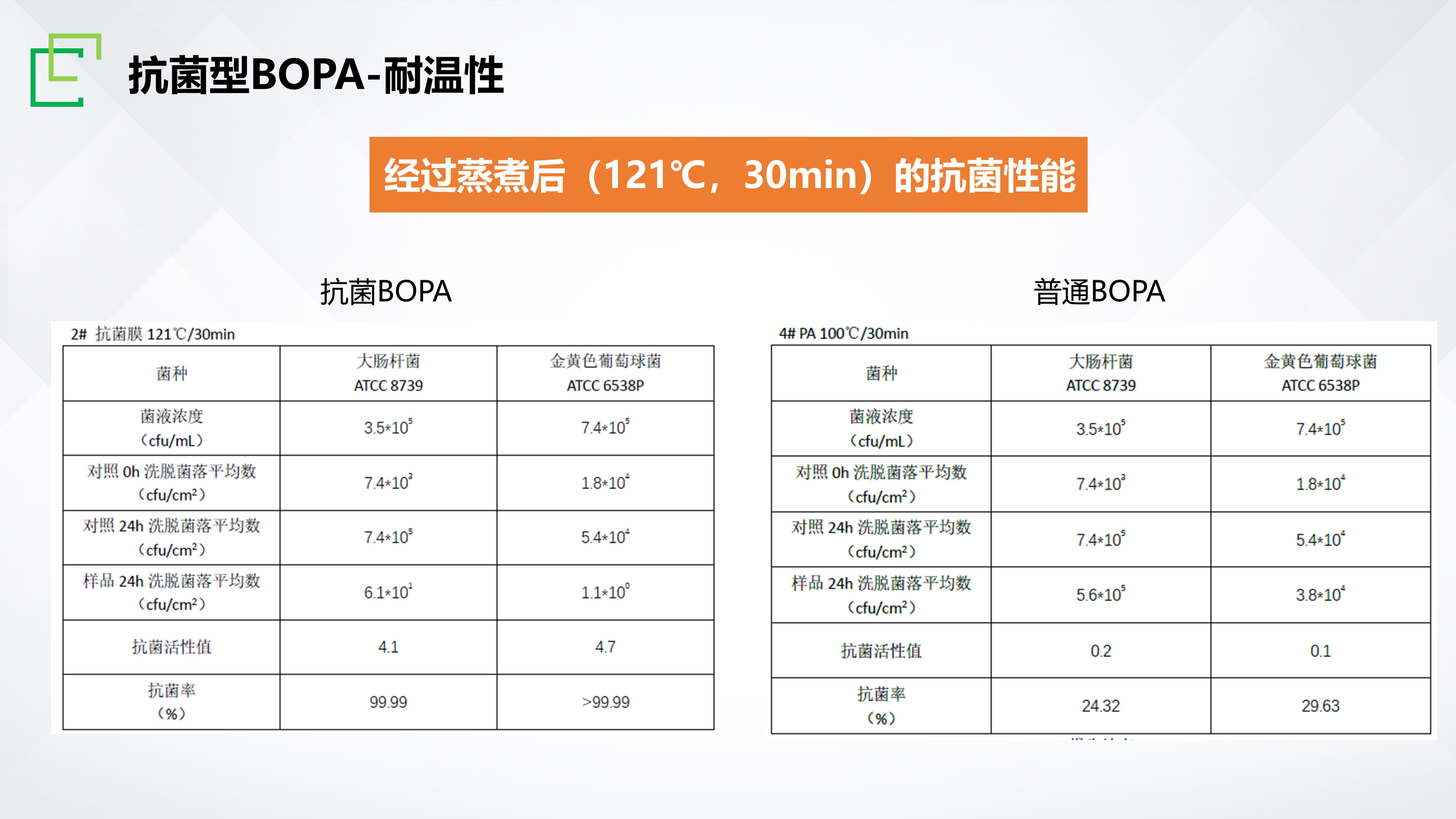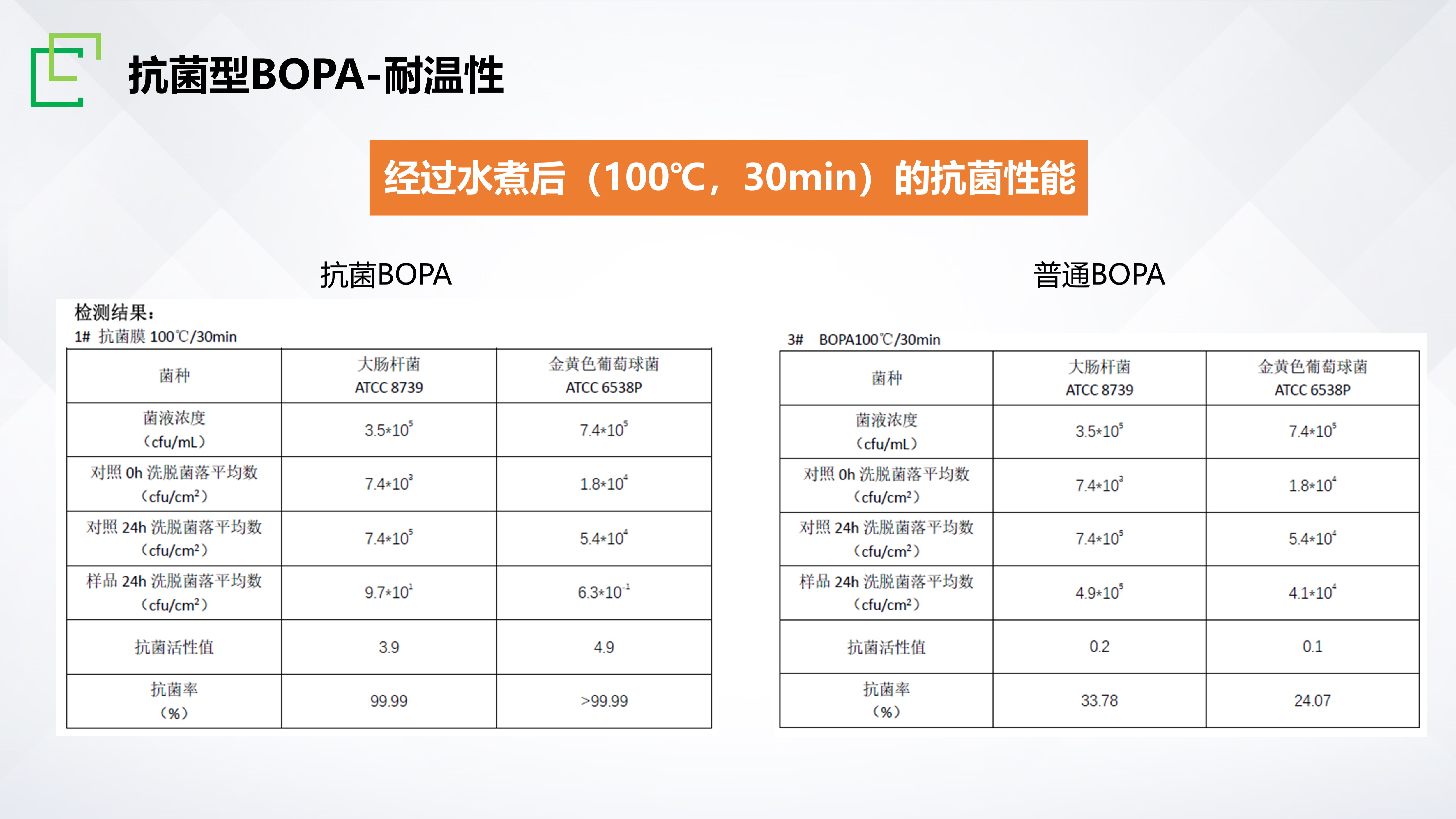 長塑矢量膜®APA抗菌型材料,是為應對食品流通過程中的病原微生物污染而研發的一款新型功能性膜材,目前已通過國際權威檢測機構SGS認證,對常見革蘭陰性、陽性代表菌大腸桿菌和金黃葡萄球菌擁有優異的抗菌性能,抗菌率≥99.9%